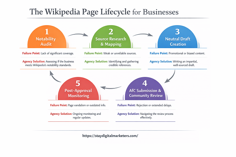 What if my business does not qualify for Wikipedia yet? A reputable agency will tell you this upfront after a notability audit. The correct path is to invest in earning media coverage, awards, industry recognition, or other forms of third-party validation before reapproaching the process. Some agencies offer notability improvement services to help clients build the necessary coverage.